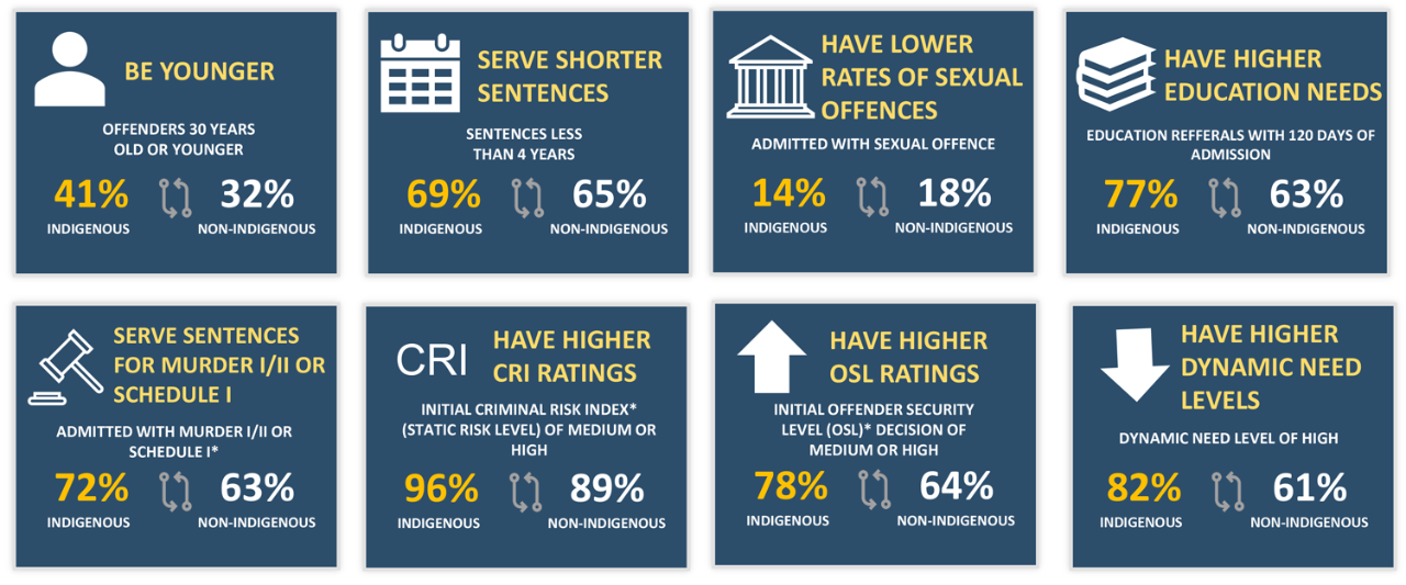 - Initial Offender Security Level (OSL) Decision Of Medium Or High are assigned to 78% Indigenous offenders compared to 64% non-Indigenous