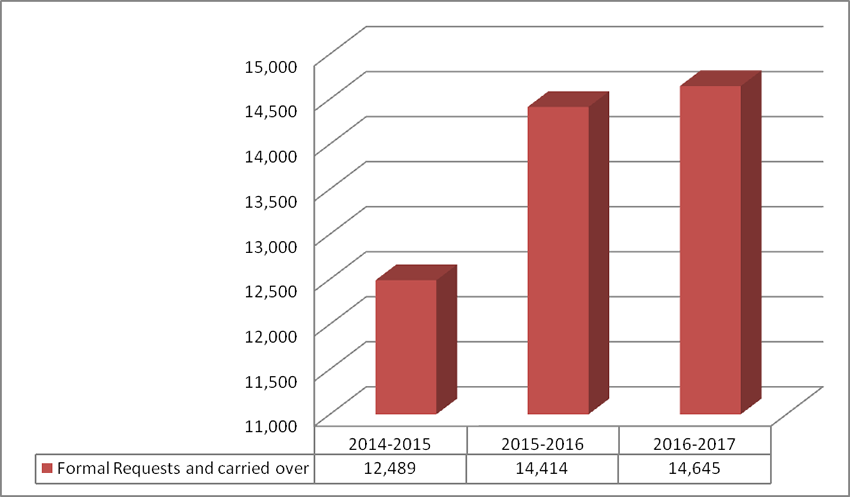 This graph shows that in the 2014-2015 reporting period, there were 12,489 formal requests that required processing. In 2015-2016, there were 14,414 requests and in 2016-2017 there were 14,645 requests.