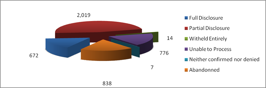 Of the 4,326 requests completed during the 2016-2017 reporting period, 672 requests were full disclosures; 2,019 were partial disclosure; 14 were withheld in their entirety; 776 were unable to process resulting from no records existing; 838 were abandoned by the applicant and seven were neither confirmed nor denied. In total, 599,106 pages were processed.