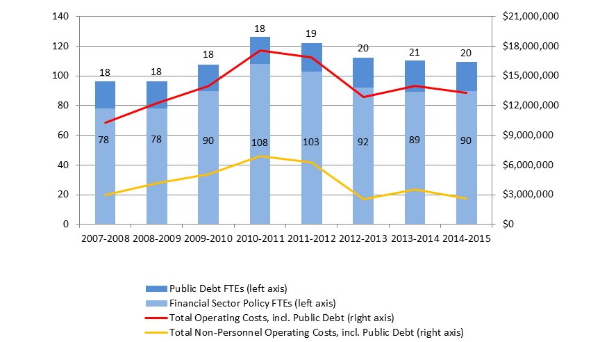 The increase in FTEs after 2008-09 was in response to different factors. For example, there was a broad-based increase in FSPB’s FTEs by two per division in 2009-10 in response to the 2008 Global Financial Crisis (Table 1). Staffing also increased to launch the temporary Task Force on Financial Literacy (three FTEs) and the Common Securities Regulator group (seven FTEs). The Securities Policy Division (eight FTEs) was created in 2010-11 to support the Government effort to establish a Canadian securities regulator and the supporting legislation.
