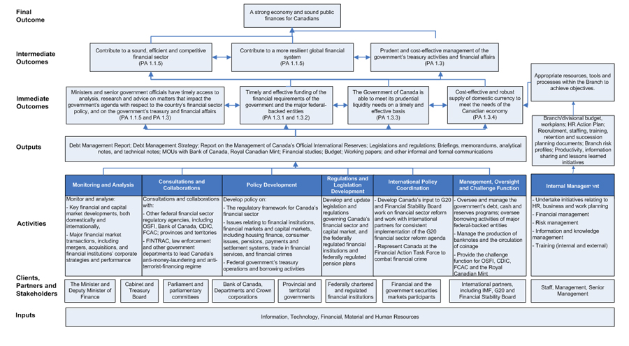 Collectively, the activities of FSPB contribute to the soundness, efficiency, and competitiveness of Canada’s financial sector and to a prudent and cost-effective management of the government’s treasury activities and financial affairs; and to the departmental strategic outcome of a strong economy and sound public finances for Canadians.