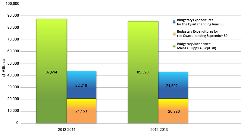 The following graph provides a comparison of budgetary authorities available for spending for the full fiscal year and budgetary expenditures for the first six months of 2012–13 and 2013–14.