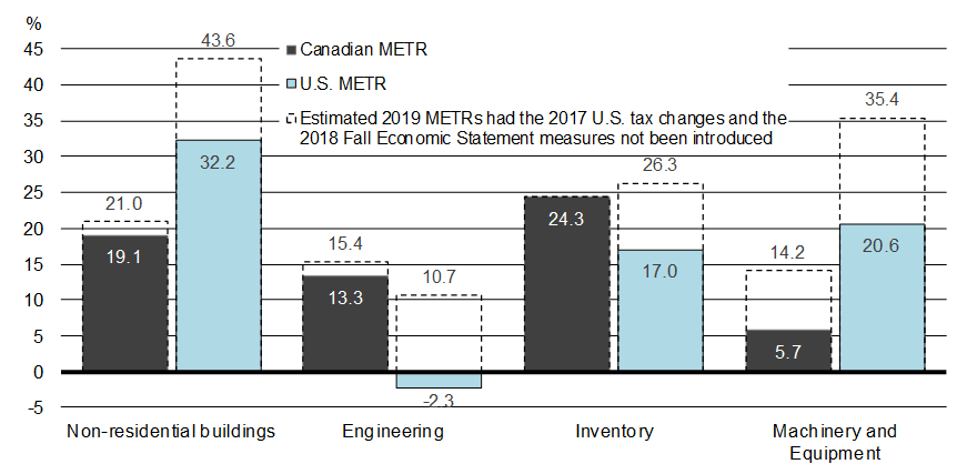 - The average METR for inventories was reduced to 17.0 per cent from 26.5 per cent in the U.S. following the reduction of its corporate income tax rate. The changes announced in the 2018 Fall Economic Statement had no impact on the Canadian METR for this grouping of assets.