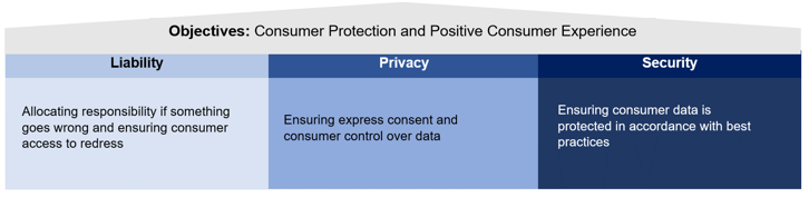 To complement existing consumer protection legislation, additional rules governing the areas of liability, privacy and security will be required. These rules should be developed with the overarching objectives of ensuring continued consumer protection and a positive consumer experience while navigating the system.