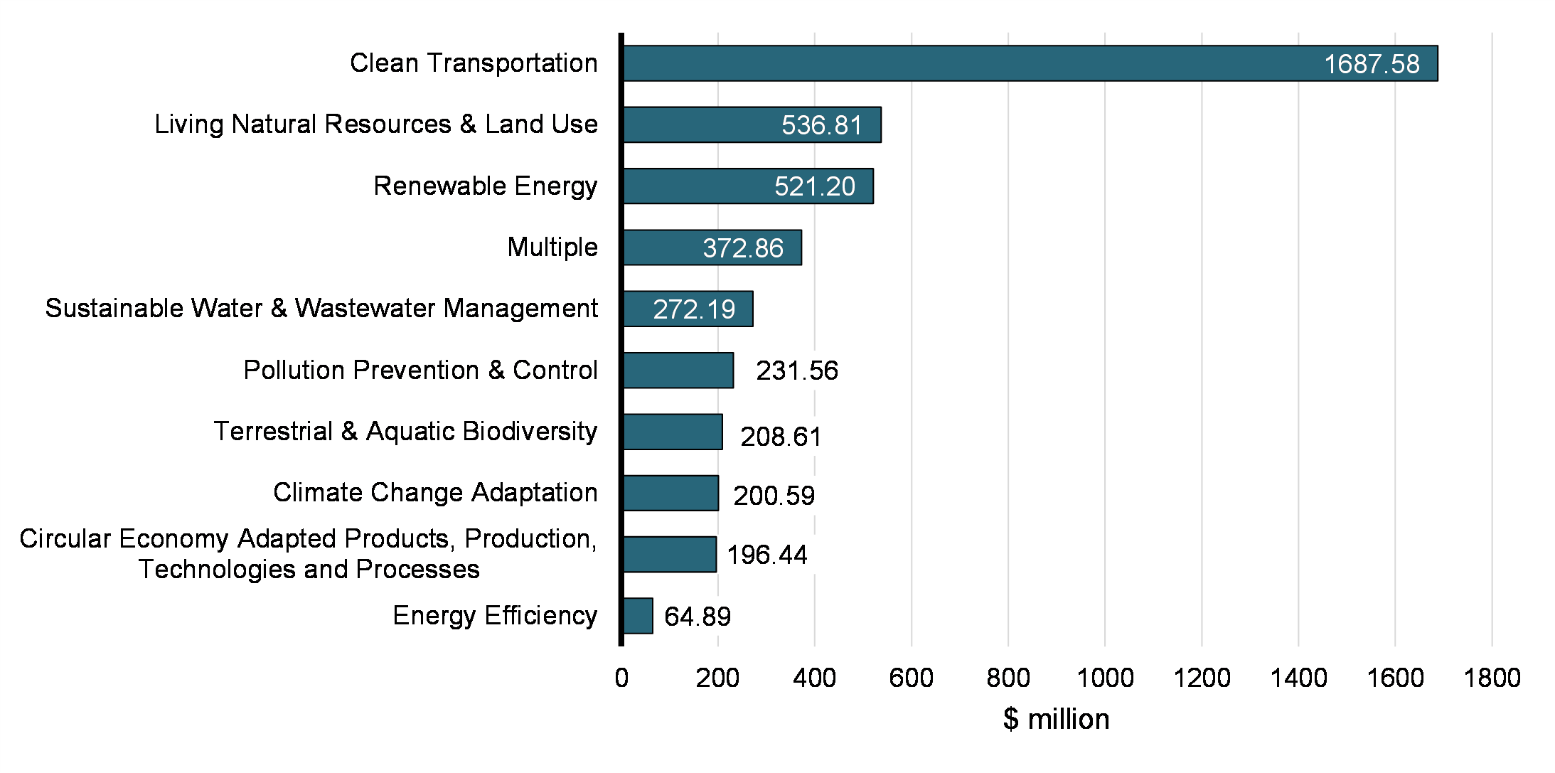 A green bond is any type of bond instrument, whose proceeds are exclusively used to finance or re-finance eligible green projects. The proceeds of Canada's inaugural green bond are allocated to a wide range of climate and environmental expenditures.