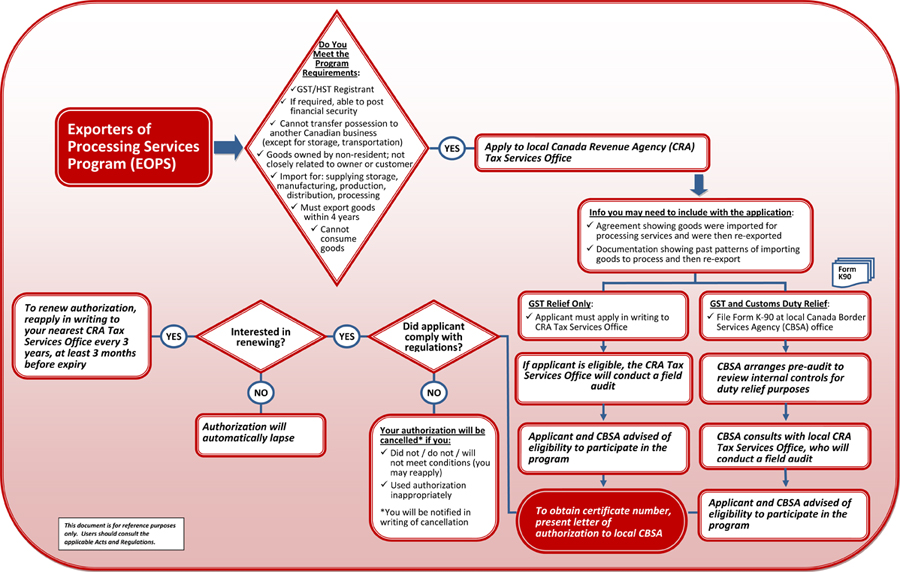 Administered by the CRA, the EOPS program relieves participants of the obligation to pay GST/HST on imports of goods belonging to non-residents, provided that these goods are imported for processing, distribution or storage and are subsequently exported. Thus, participation in the program helps EOPS program participants increase cash flow and reduce operating expenses.