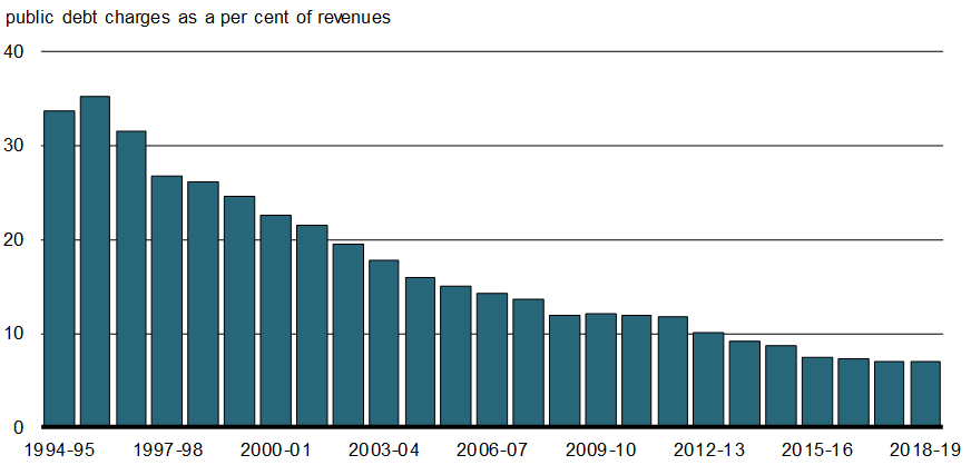 - Public debt charges amounted to per cent of expenses in 2018–This is down from a peak of nearly 30 per cent in the mid-1990s.