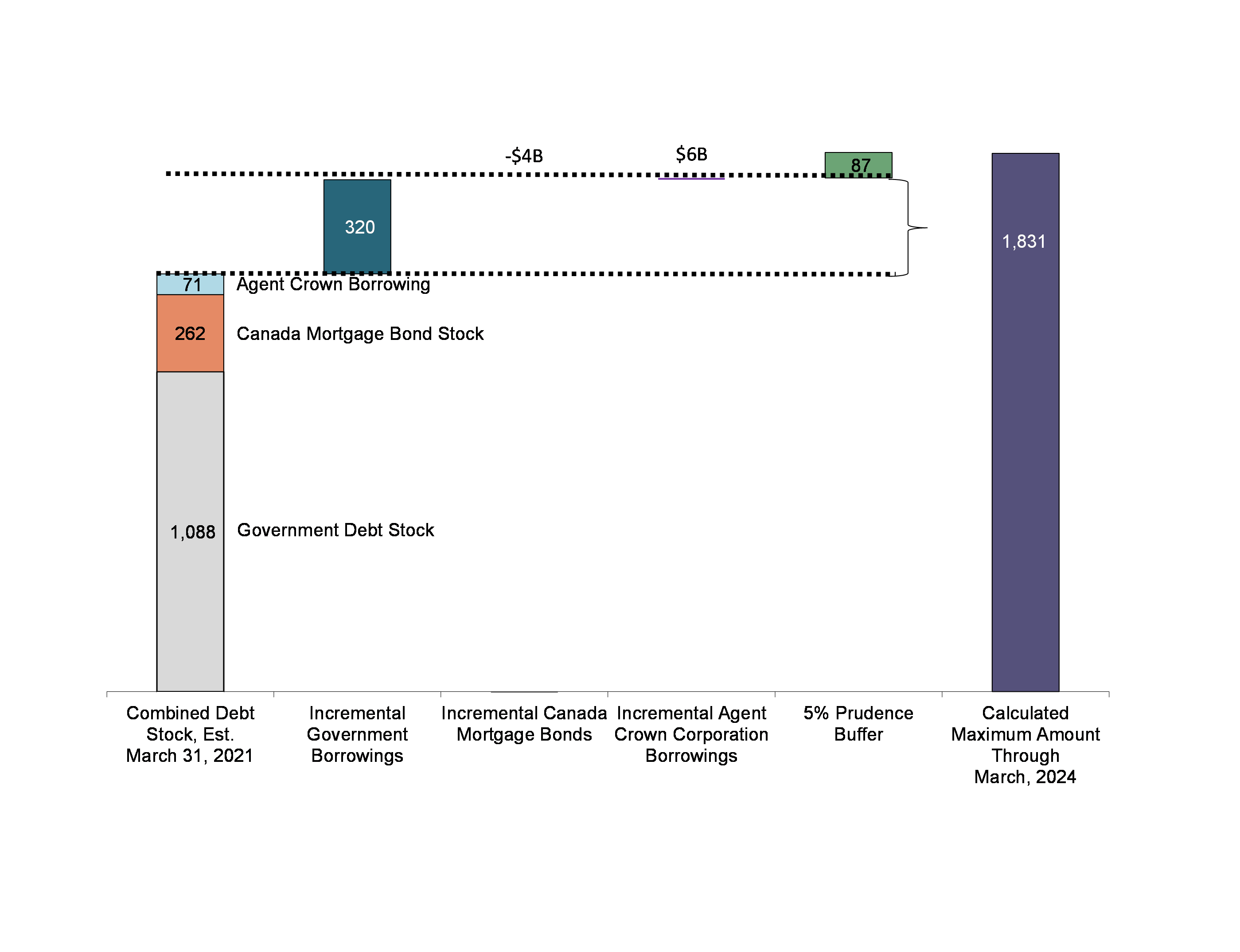 This amount was determined based on the aggregate total maximum level of outstanding debt for the various categories over three fiscal years as projected at the time of Budget 2021, as well as a prudence buffer of 5 per cent (Figure 1).