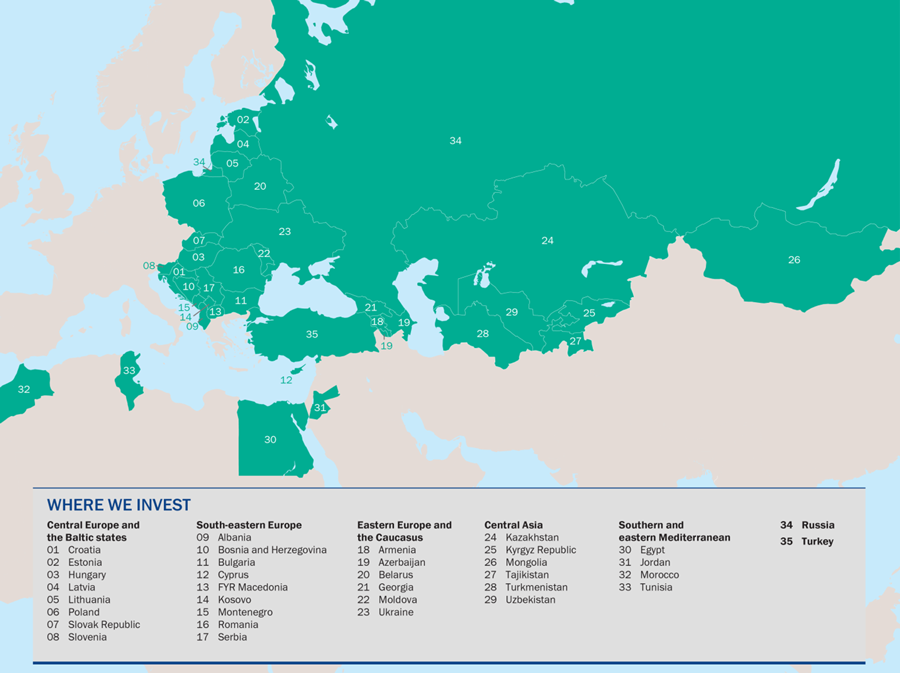 The Bank’s shareholders include 64 countries from across the globe and two intergovernmental organizations (the European Union and the European Investment Bank). As at December 31, 2014, the Bank’s total assets reached €52 billion, while its liabilities amounted to €38 billion. A robust capital position has helped the Bank to maintain relatively stable annual investment[2] levels in its countries of operations in recent years, in the range of €8 billion-€9 billion per year.