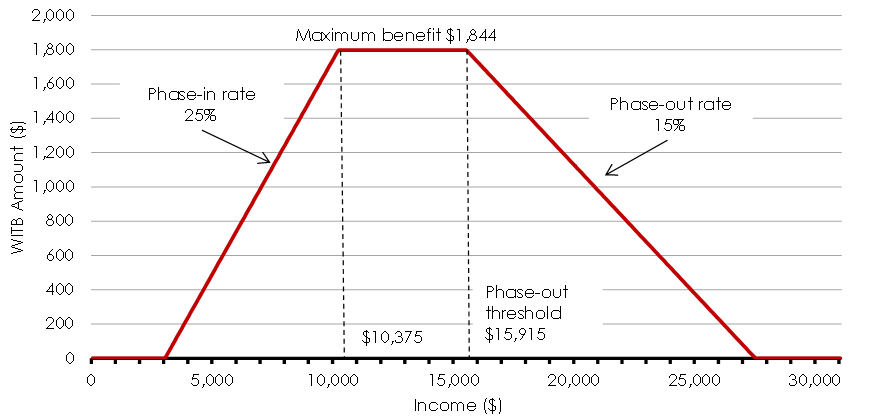 Chart 1 shows how the WITB benefits an eligible couple or family with children in 2015. It provides a refundable tax credit of 25% of each dollar of working income in excess of $3,000, reaching a maximum benefit of $1,844 at $10,375 of working income. Once net income exceeds $15,915, the benefit is reduced at a rate of 15% of each additional dollar, until the benefit is fully phased out at an income of $28,209. Individuals who are also eligible for the Disability Tax Credit may receive a WITB disability supplement of up to $508.