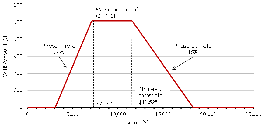 The amount of the WITB payment for an eligible individual increases proportionately with family working income above a defined phase-in threshold up to a specified maximum benefit level, and declines proportionately with adjusted family net income above a defined phase-out threshold.