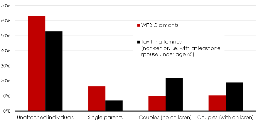 Limiting our analysis to Employment Insurance regular benefits (i.e., income replacement benefits to individuals who lose their jobs through no fault of their own and are available for and able to work but cannot find a job), the share of WITB recipients is more consistent across family types, ranging between 8% for unattached individuals to 13% for single parents.
