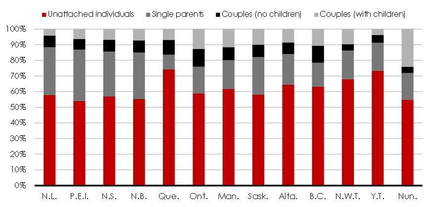 | Unattached individuals | Single parents | Couple (no children) | Couple (with children) | Total | |