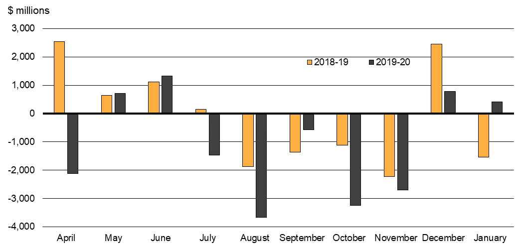 With a budgetary deficit of $10.6 billion and a requirement of $5.9 billion from non-budgetary transactions, there was a financial requirement of $16.5 billion for the April 2019 to January 2020 period, compared to a financial requirement of $12.6 billion for the same period the previous year.
