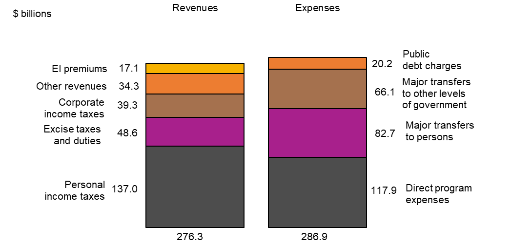 For the April to January period of the 2019–20 fiscal year, the government posted a budgetary deficit of $10.6 billion, compared to a deficit of $1.2 billion reported for the same period of 2018–19. Revenues were up $7.9 billion, or 2.9%, largely reflecting an increase in personal income tax revenues. Program expenses were up $16.6 billion, or 6.6%, reflecting increases in major transfers to persons, major transfers to other levels of government and direct program expenses. Public debt charges increased by $0.6 billion, or 3.2%, largely reflecting higher Consumer Price Index adjustments on Real Return Bonds and a higher average effective interest rate on the stock of Government of Canada treasury bills.