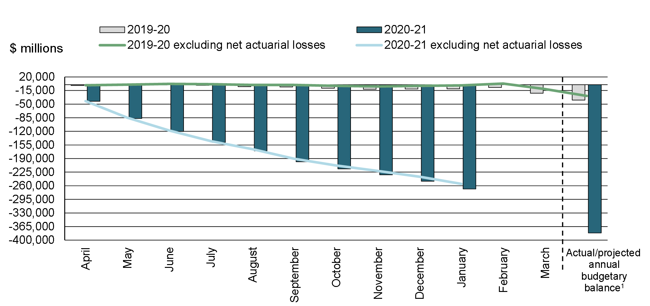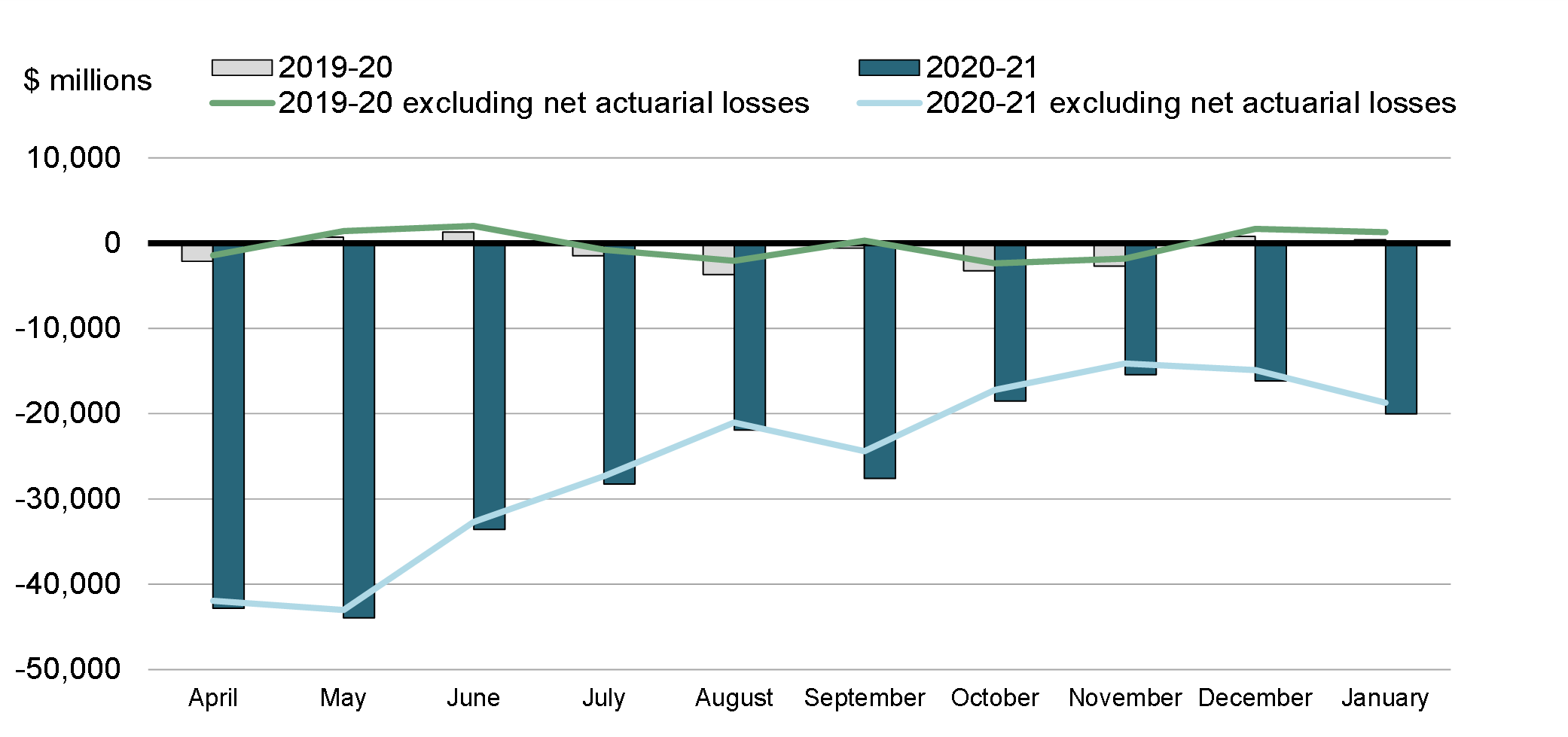 There was a budgetary deficit of $20.0 billion in January 2021, compared to a surplus of $0.4 billion in January 2020. The budgetary deficit before net actuarial losses was $18.7 billion, compared to a surplus of $1.3 billion in January 2020. The budgetary balance before net actuarial losses is a new measure introduced to supplement the traditional budgetary balance and improve the transparency of the government's financial reporting by isolating the impact of the amortization of net actuarial losses arising from the revaluation of the government's pension and other employee future benefit plans.