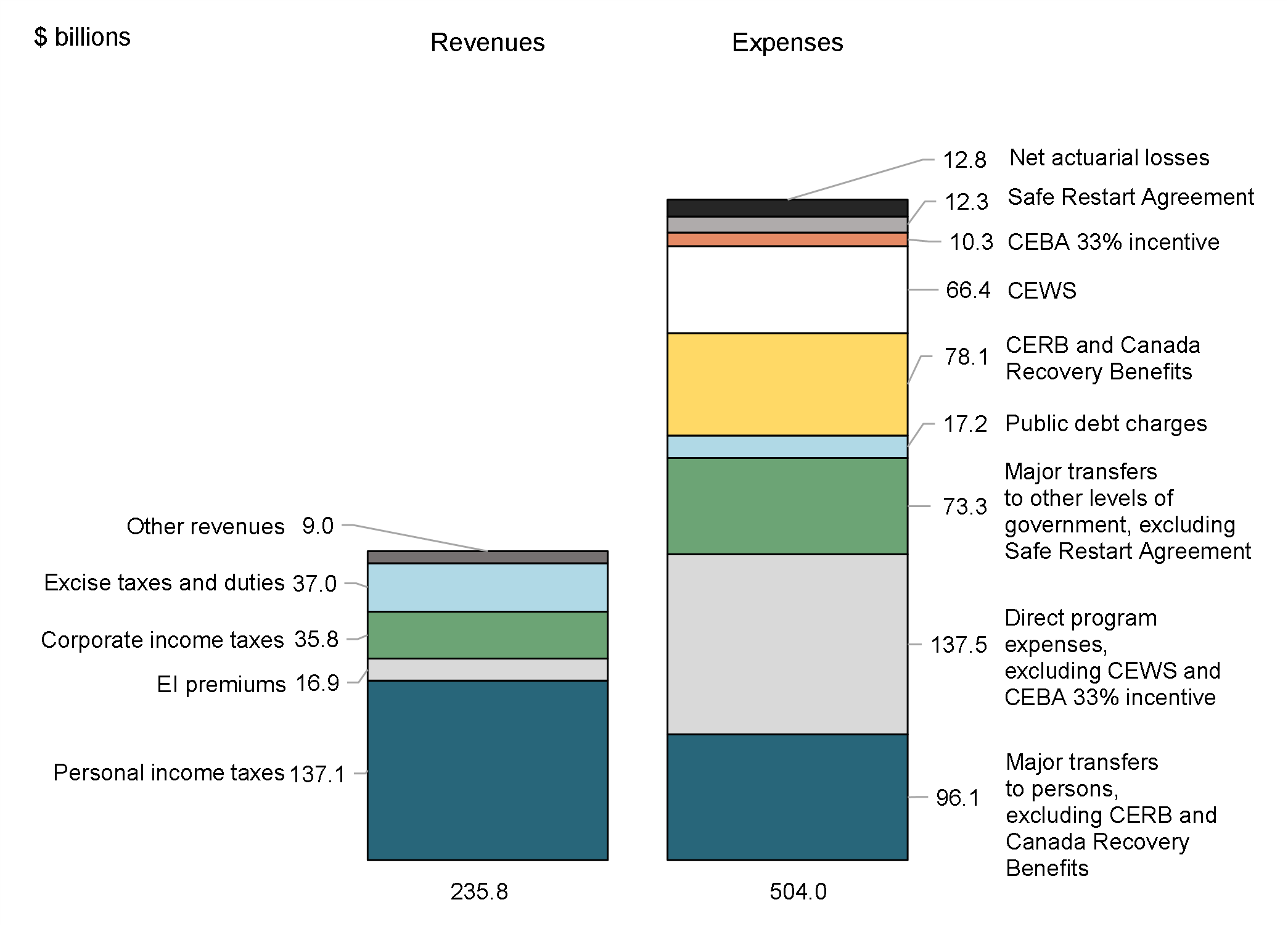 - Program expenses excluding net actuarial losses were up $216.3 billion, or 83.9 per cent, largely reflecting transfers to individuals, businesses, and other levels of government under the Economic Response Plan, including the Canada Emergency Response Benefit (CERB) and Canada Recovery Benefits, the Canada Emergency Wage Subsidy (CEWS), transfers under the Safe Restart Agreement, and the 33 per cent incentive for the Canada Emergency Business Account (CEBA).