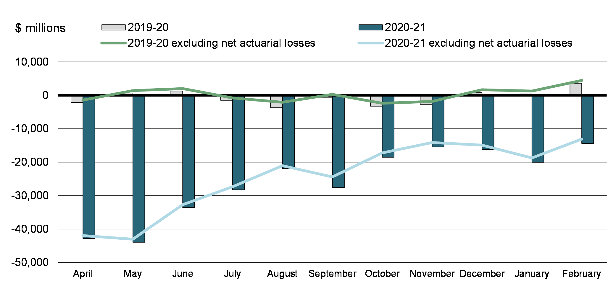There was a budgetary deficit of $14.4 billion in February 2021, compared to a surplus of $3.6 billion in February 2020. The budgetary deficit before net actuarial losses was $13.1 billion, compared to a surplus of $4.5 billion in February 2020. The budgetary balance before net actuarial losses is a new measure introduced to supplement the traditional budgetary balance and improve the transparency of the government's financial reporting by isolating the impact of the amortization of net actuarial losses arising from the revaluation of the government's pension and other employee future benefit plans.