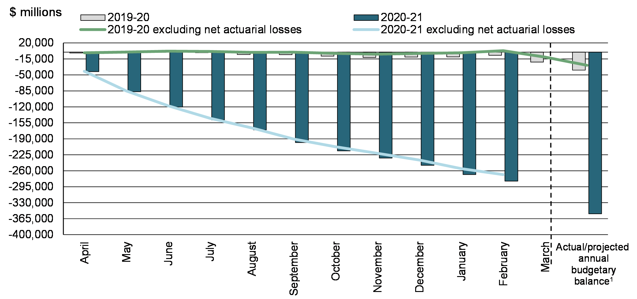 For the April to February period of the 2020–21 fiscal year, the government posted a budgetary deficit of $282.6 billion, compared to a deficit of $7.0 billion reported for the same period of 2019–20. The budgetary deficit before net actuarial losses was $268.4 billion, compared to a surplus of $2.9 billion for the same period of 2019–20.