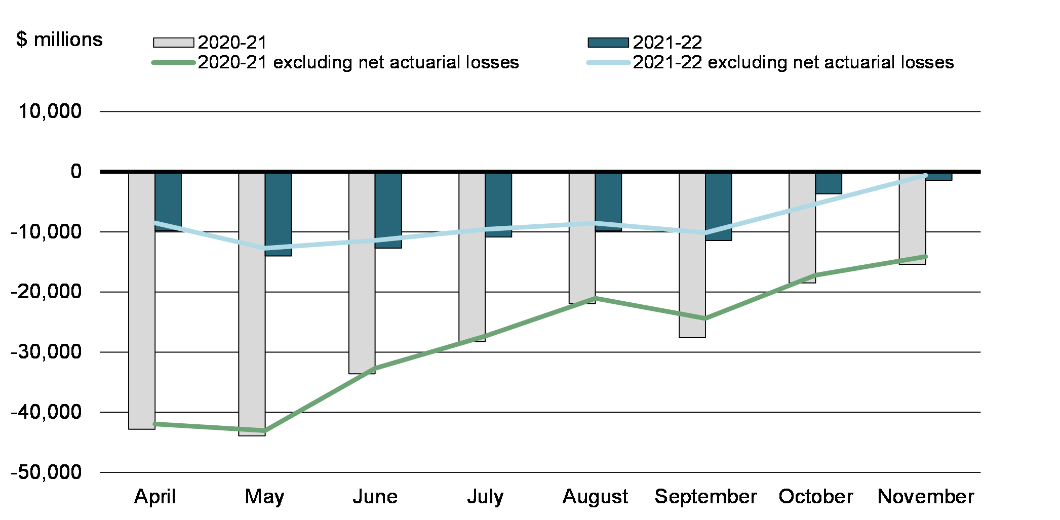 There was a budgetary deficit of $1.4 billion in November 2021, compared to a deficit of $15.4 billion in November 2020. The budgetary deficit before net actuarial losses was $0.6 billion, compared to a deficit of $14.1 billion in the same period of 2020–21. The budgetary balance before net actuarial losses is intended to supplement the traditional budgetary balance and improve the transparency of the government's financial reporting by isolating the impact of the amortization of net actuarial losses arising from the revaluation of the government's pension and other employee future benefit plans.