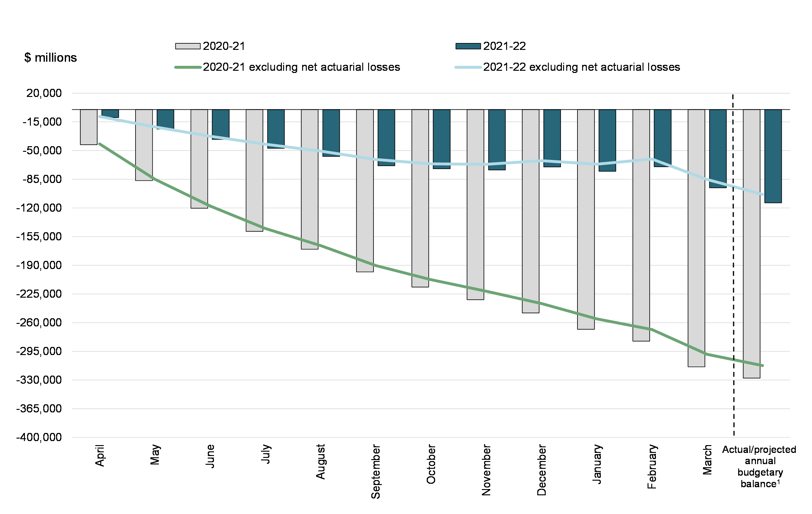 There was a budgetary deficit of $25.7 billion in March 2022, compared to a deficit of $31.4 billion in March 2021. The budgetary deficit before net actuarial losses was $24.9 billion, compared to a deficit of $30.2 billion in the same period of 2020-21. The budgetary balance before net actuarial losses is intended to supplement the traditional budgetary balance and improve the transparency of the government’s financial reporting by isolating the impact of the amortization of net actuarial losses arising from the revaluation of the government’s pension and other employee future benefit plans.