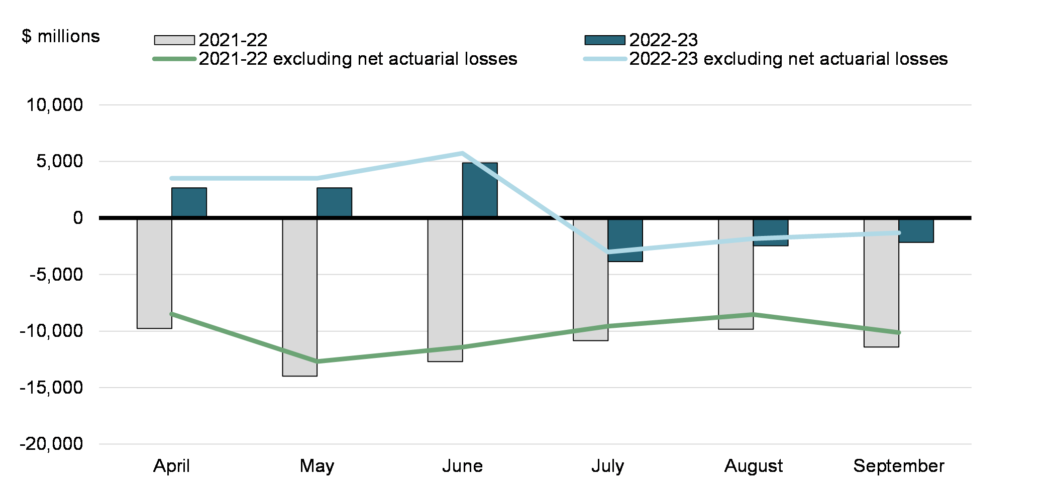 There was a budgetary deficit of $2.2 billion in September 2022, compared to a deficit of $11.4 billion in September 2021. The budgetary deficit before net actuarial losses was $1.3 billion, compared to a deficit of $10.1 billion in the same period of 2021-22. The budgetary balance before net actuarial losses is intended to supplement the traditional budgetary balance and improve the transparency of the government's financial reporting by isolating the impact of the amortization of net actuarial losses arising from the revaluation of the government's pension and other employee future benefit plans.
