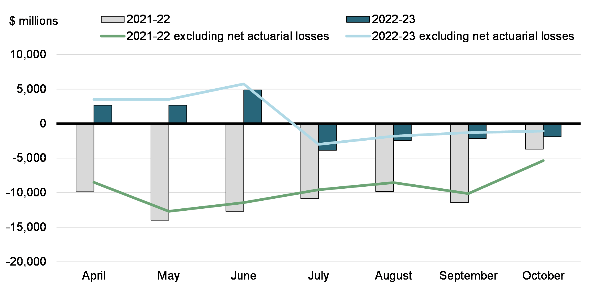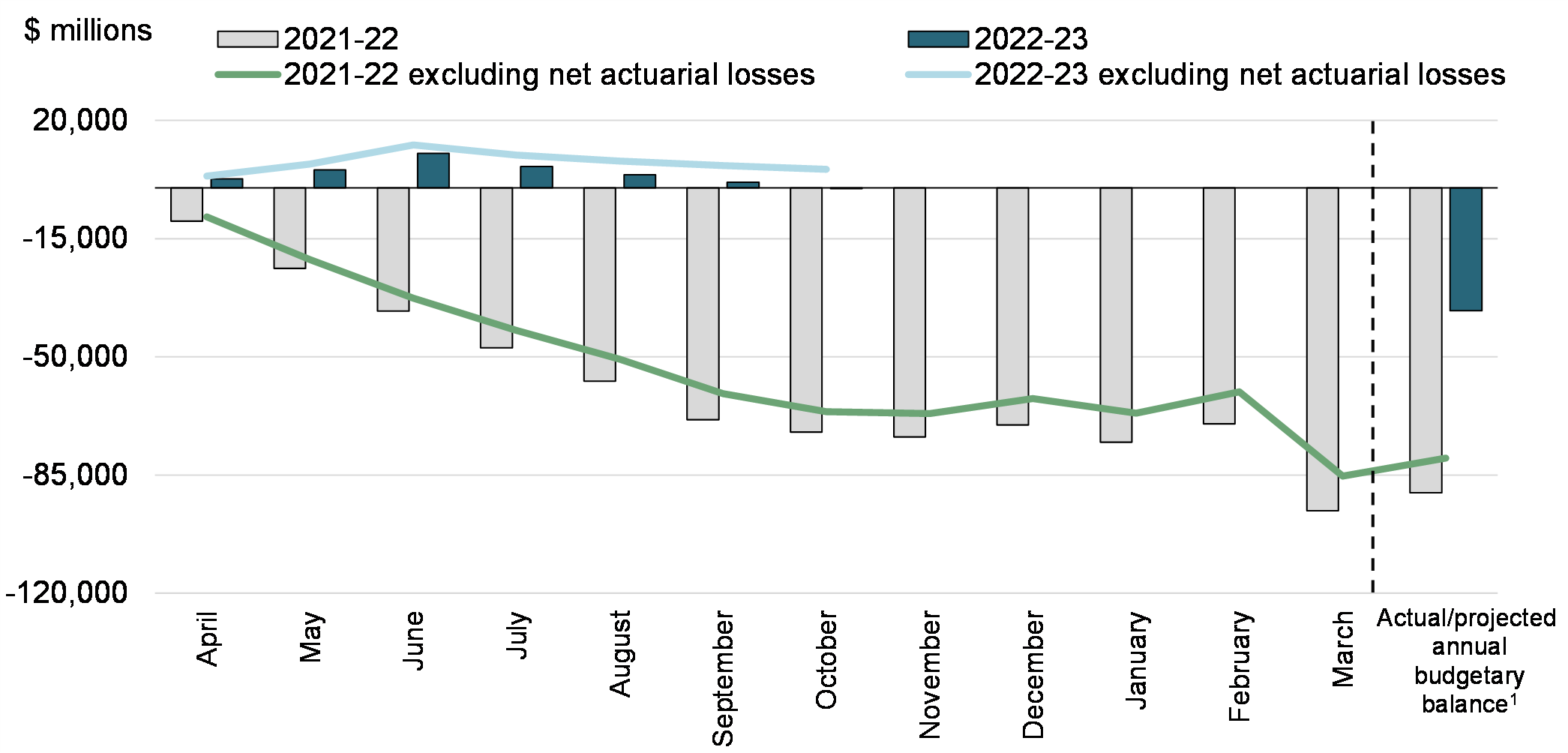 There was a budgetary deficit of $1.9 billion in October 2022, compared to a deficit of $3.7 billion in October 2021. The budgetary deficit before net actuarial losses was $1.1 billion, compared to a deficit of $5.4 billion in the same period of 2021-22. The budgetary balance before net actuarial losses is intended to supplement the traditional budgetary balance and improve the transparency of the government’s financial reporting by isolating the impact of the amortization of net actuarial losses arising from the revaluation of the government’s pension and other employee future benefit plans.