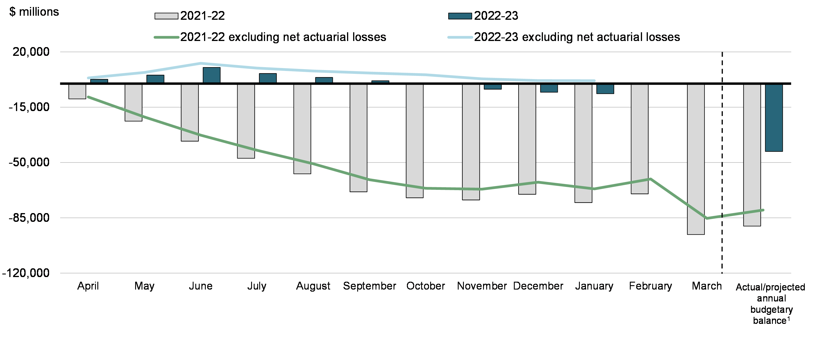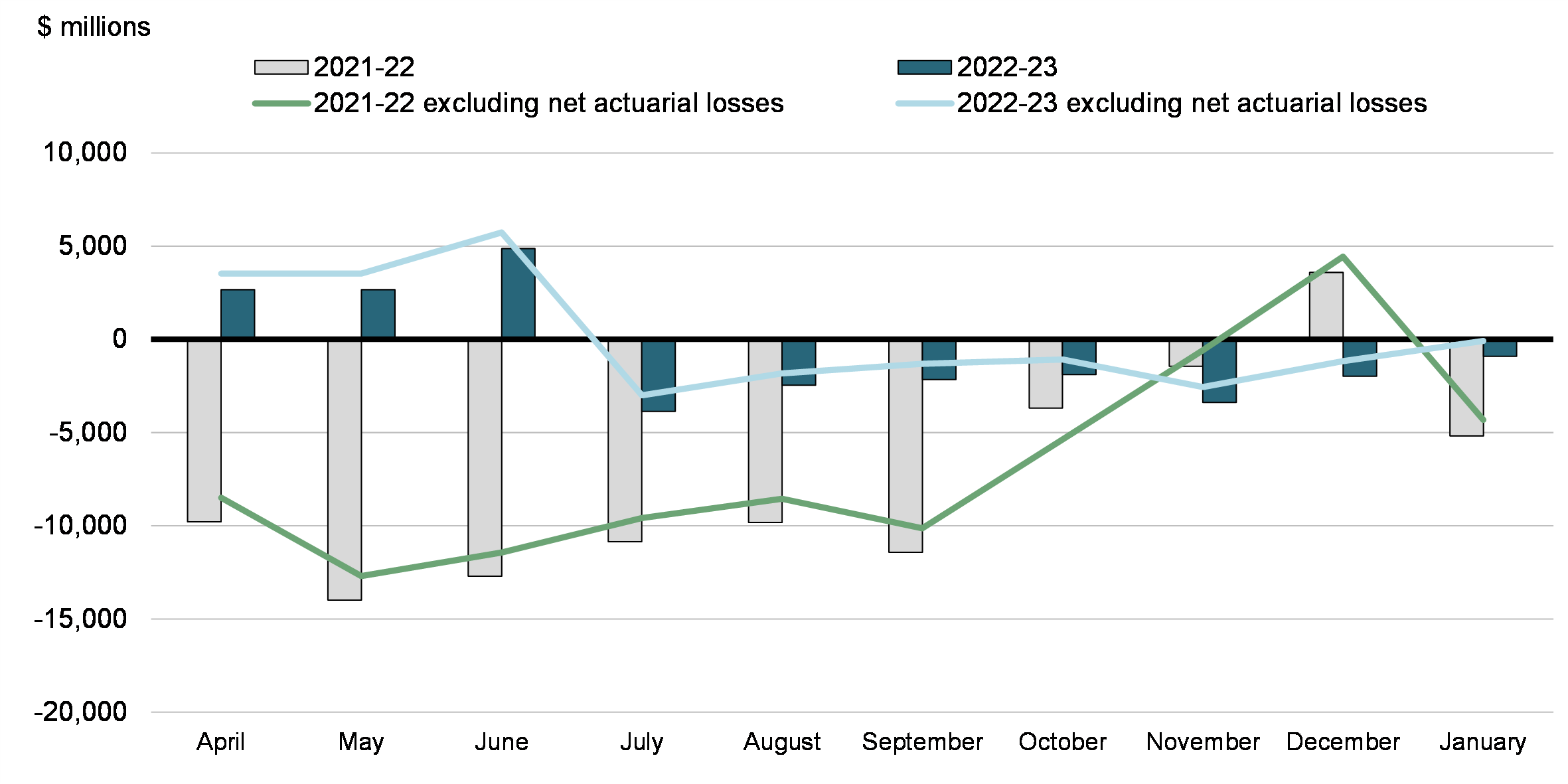 There was a budgetary deficit of $0.9 billion in January 2023, compared to a deficit of $5.2 billion in January 2022. The budgetary deficit before net actuarial losses was $0.1 billion, compared to a deficit of $4.3 billion in the same period of 2021-22. The budgetary balance before net actuarial losses is intended to supplement the traditional budgetary balance and improve the transparency of the government's financial reporting by isolating the impact of the amortization of net actuarial losses arising from the revaluation of the government's pension and other employee future benefit plans.