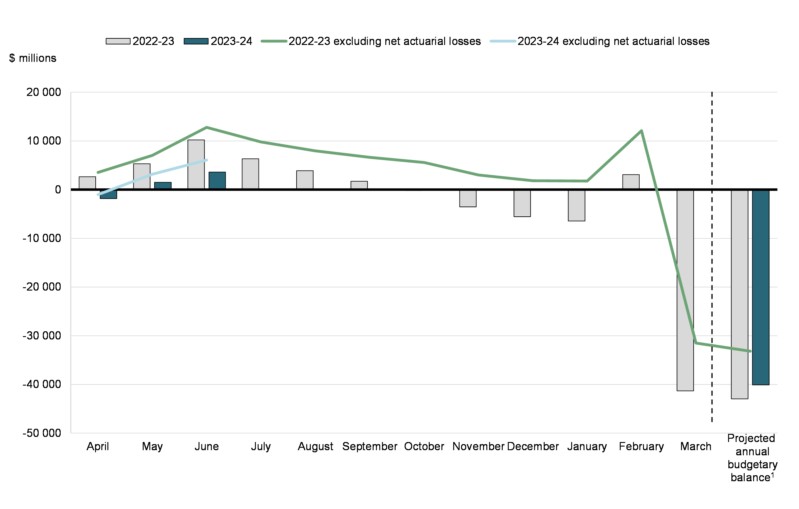 There was a budgetary surplus of $2.1 billion in June 2023, compared to a surplus of $4.9 billion in June 2022. The budgetary surplus before net actuarial losses was $2.9 billion, compared to a surplus of $5.7 billion in the same period of 2022-23. The budgetary balance before net actuarial losses is intended to supplement the traditional budgetary balance and improve the transparency of the government's financial reporting by isolating the impact of the amortization of net actuarial losses arising from the revaluation of the government's pension and other employee future benefit plans.