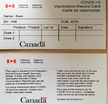 Regular Force members are advised to use the CAF issued PVC whenever proof of vaccination is required. Reg F CAF members (those without provincial or territorial health care cards) should refrain from asking their provincial or territorial system for a proof of vaccination unless that province/territory have indicated that they are providing proof of vaccination to CAF members.