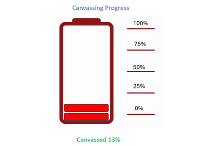 The speedometer demonstrates the Department’s goal of being 100% canvassed and our progress of being 13% canvassed.