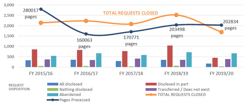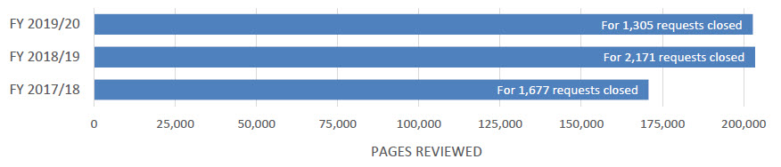 A total of 1,691 requests were completed during the reporting period, 827 fewer requests than in FY 2018-19 representing a 33% decrease. Even though fewer requests were completed this FY, the total pages processed remained consistent with the previous reporting period which is indicative of a steady workload year over year.