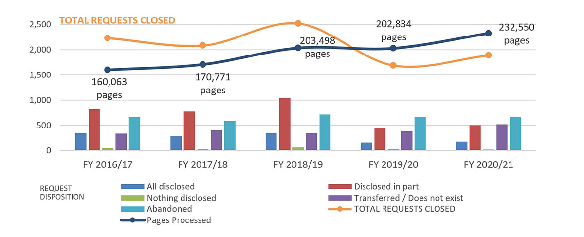 In 2020-2021, 181 were all disclosed, 504 were disclosed in part, 23 where nothing was disclosed, 519 were transferred or does not exist and 661 were abandoned. A total of 1888 requests were closed.