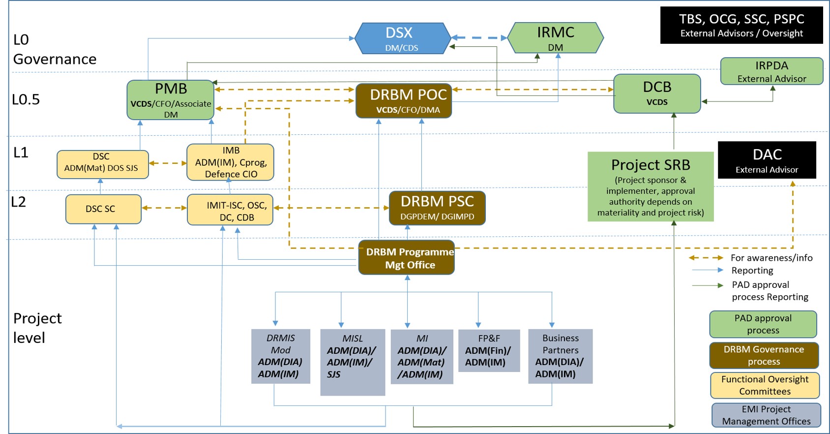 Ensures that Programme activities, along with the projects and EMIs under it, remain aligned with strategic objectives and are appropriately supported by the various DND/CAF business areas. In conjunction with other departmental governance bodies (including DSX, PMB, IRMC, etc.), the DRBM POC meetings provide a venue for Level 0 decision making and direction setting for the DRBM Programme. |
