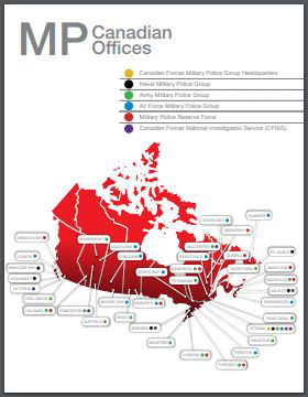 A map of Canada illustrates what type of military police group exists in which city across the country. They are: