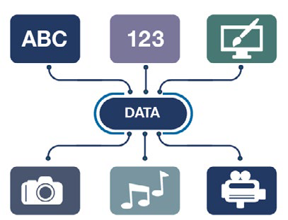 This figure illustrates data as the representation of facts in the form of text, numbers, graphics, images, sound, or video.