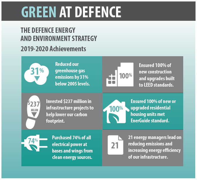 - DND continued to build and renovate to meet high-performing building standards, such as the Leadership in Energy and Environmental Design Silver standard or equivalent. Since 2017, 100% of major upgrades and new defence buildings were built to the latest standards for excellence in green building design, construction and maintenance.