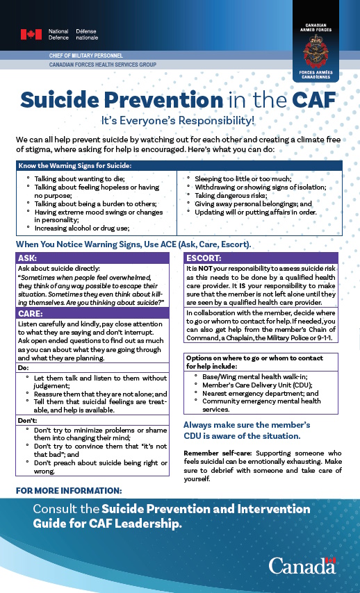 FOR MORE INFORMATION: Consult the Suicide Prevention and Intervention Guide for CAF Leadership.