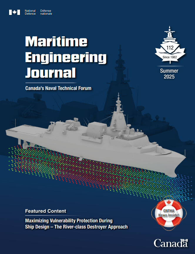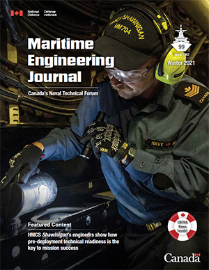 The Maritime Engineering Journal (MEJ) has been the principal publication of the Royal Canadian Navy’s Naval Technical Community; this community includes past and present serving members of the Royal Canadian Navy (RCN) and Public Servants. Since 1982, the MEJ provides unclassified discussion surrounding naval technical challenges, naval history, and human interest stories from within the Naval Technical Community.