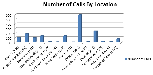The calls ranged in duration but, on average, lasted for approximately 15 minutes. Calls originated from every Canadian province and territory, as well as various locations outside of Canada from members serving abroad. The majority of these calls originated from Ontario, as illustrated in the graph below.