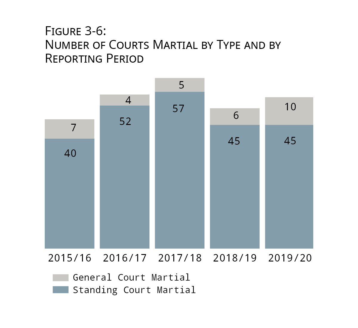 A total of 55 courts martial were completed during this reporting period.Footnote 23 Of those, 45 were SCMs and 10 were GCMs. This is consistent with the historical average of courts martial for the past five years (54). In this reporting period, there was a slight increase in the number of GCMs in comparison to the average number of GCMs for the past five reporting periods (6). A complete picture of the number of courts martial for the last five reporting periods, by type, can be found at Figure 3-6.