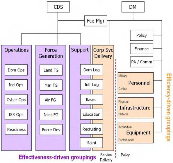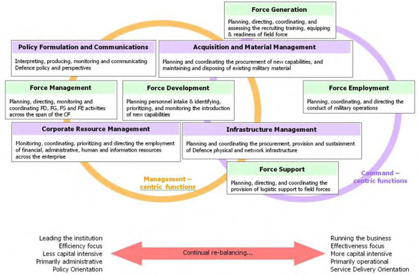 - Refocusing the corporate military (VCDS and CMP) and civilian organizations on strategic management and policy, and parsing out their service delivery activities to other organizations better suited to do so where efficiencies can be realized;