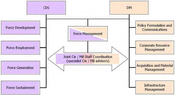 A key and recurring theme throughout the work of the team was the overall integration and inherent interdependencies of the DND/CF. This starts right at the top with a diarchy of command responsibility (CDS) and fiscal accountability (DM), and the extent to which the integration and intersection of accountabilities and responsibilities affects the overall functioning of the DND/CF. Without looking for integrated solutions that reflect this diarchy, any attempts to change one part of the structure or related process could have a potentially adverse and unpredictable impact somewhere else. The extent of this integration is represented in some of the analysis that identifies, for example that as of March 2010 approximately 64% of the civilian workforce of DND is actually employed within a military structure, and several thousand military personnel are employed in the performance of departmental functions. Neither of these examples is an issue in and of themselves; they simply speak to the integrated nature of the DND/CF relationship.