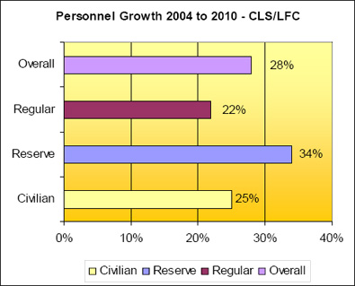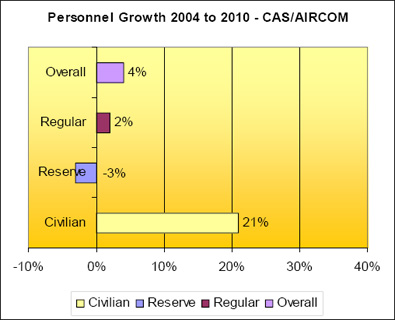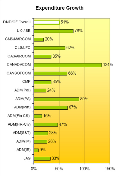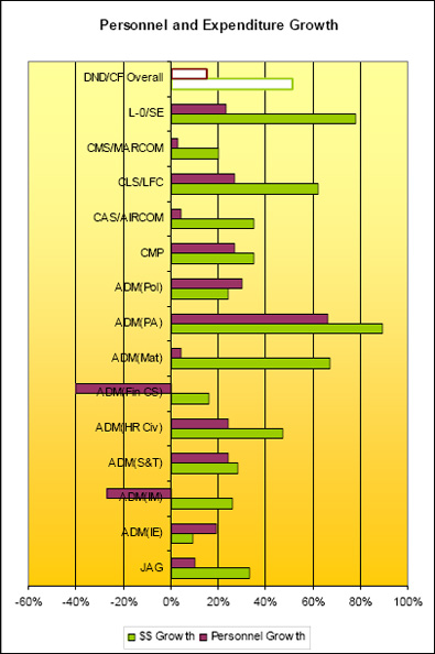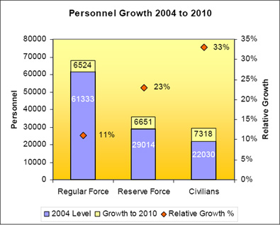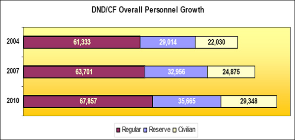 - Overall DND/CF people grew (Regulars / Reserves / Civilians) by a total of 18%; and overall funding has increased by a nominal 51%;