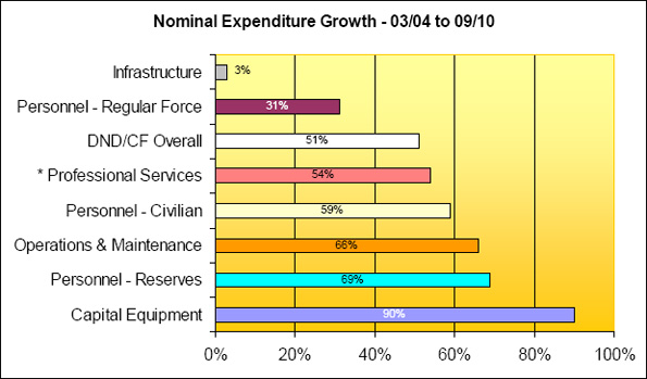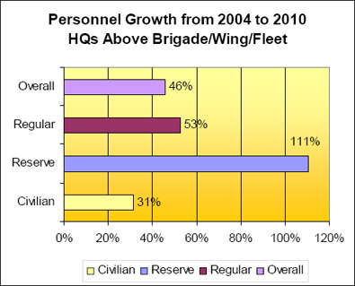 In a similar vein we also found a significant increase in military and civilian headquarters personnel (46%) from 2004 to 2010, a figure which does not include the thousands of contractors, consultants and professional services people - mainly in Ottawa – that are needed to manage the increased volume of process and work between the various headquarters and supporting organizations; and to compound the issue, there are a series of information technology stovepipes - built over the last two decades - that have evolved under a highly decentralized model that is both expensive and counterproductive to expediting the right information getting to the right decision makers for them to make the right decisions at the right time, despite the sterling work of those who are doing their best to bring resolution to this issue. And, as pointed out by the Auditor General, there are several recent examples where we were not as efficient as we could have been and where we need to improve. [1] These are symptomatic of old processes, new overhead layered on old, lots of committees, and in certain areas a sometimes bewildering number of steps - not all of which are within the sole purview of DND - to actually achieve a government directed spending outcome; this has often frustrated the best intentions of civil servants, the military, other supporting Departments and Canadian industry, all of whom should want the best value for the tax-payers dollar in support of the deployable forces.