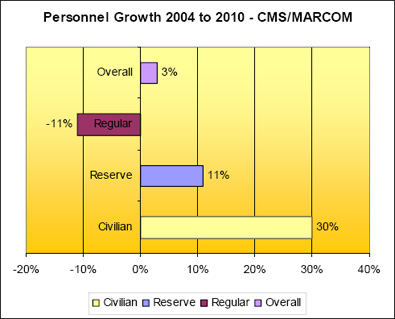 From the outset the team pursued guiding principles in line with ideas articulated in the Canada First Defence Strategy: the need to make every dollar count in terms of the pursuit of operational efficiency; the need to ensure that the essential current and future outputs of the CF (well trained, well equipped and agile front-line forces of regular and part-time reserve personnel) are insulated from possible reductions; and the need to accurately quantify the full extent of the overhead within the DND/CF so as to remove (as much as possible) uninformed opinion and bias from the ensuing debates around structural options for the future. To establish trend lines, we used three data points in time: 31 March 2004, 2007 and 2010 (the end of the respective fiscal years). We have not included data from 2011 as the books have not yet been closed off and the information is not publicly available.