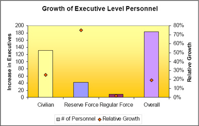 - The executive leadership, as defined by Treasury Board, grew at a rate higher than that of overall growth of lower ranking personnel within DND/CF. Regulars (2%), Reserves (75%), Civilians (25%); for a cumulative increase of 19%. In terms of recommendations, the overall intent of the CFDS can be better achieved - as well as catering to emerging requirements - if the following high-level measures are implemented: