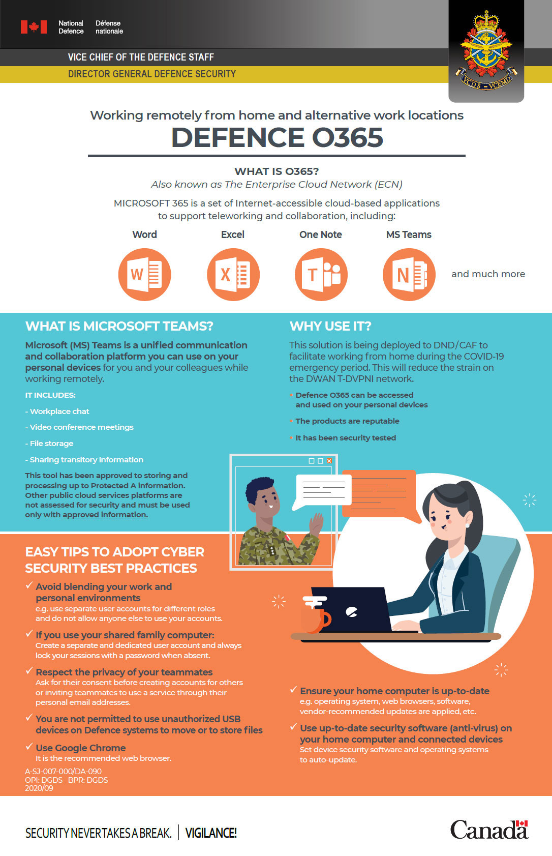 To counter growing information security vulnerabilities while personnel work remotely, DGDS will start this campaign in September 2020 and kick-off the campaign with a focus on enhancing IT security and security of information for working remotely. This renewed focus on IT security vigilance takes into account that the COVID-19 pandemic has dramatically altered shifted the way we work. Many DND employees and CAF members are now working remotely and using new tools like Defence O365 to conduct business.