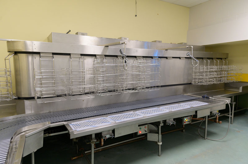 The dish return conveyor – trays are put onto the conveyer, which in turn brings the tray around to the staff for sorting. The new grey conveyor belt was installed to allow more weight.