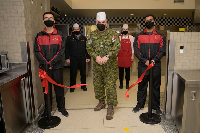 RMC Commandant BGen Sébastien Bouchard, his wife Karine, and RMC College Chief CPO1 Marion Pivin, welcomed back a small group of naval and officer cadets serving them at their new-and-improved dining hall with an official ribbon cutting and breakfast on January 25, 2021.